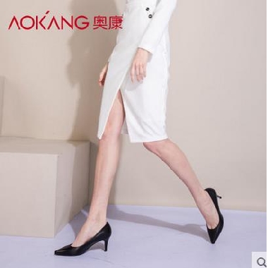 奥康女鞋 尖头高跟鞋细跟真皮纯色浅口通勤OL女单鞋工作鞋猫跟鞋