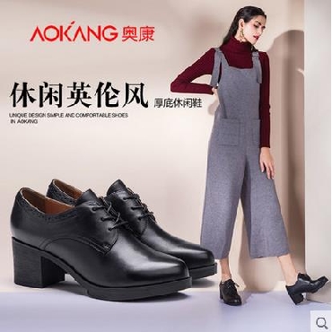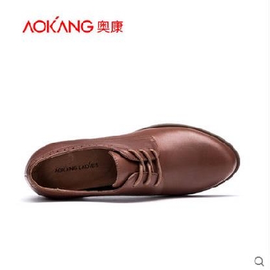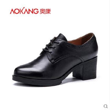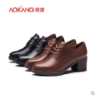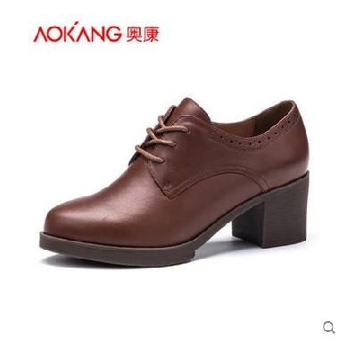 奥康女鞋 秋季新款粗跟系带休闲鞋牛皮简约圆头及踝女单鞋
