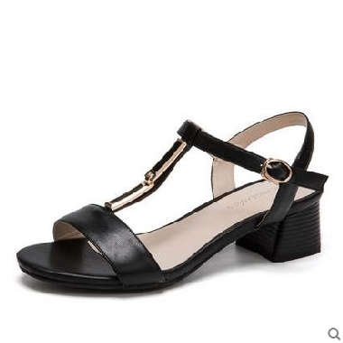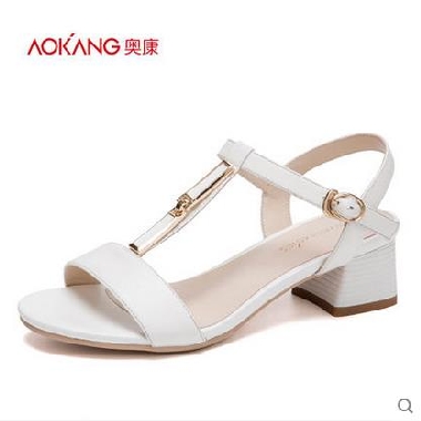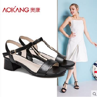 • 奥康2017新款夏季一字带粗跟凉鞋女中跟真皮羊皮简约百搭方跟女鞋