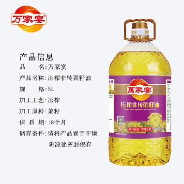萬家宴食用油一级菜籽油5L非转基因物理压榨纯菜油 清香型 一级菜籽油清香少烟